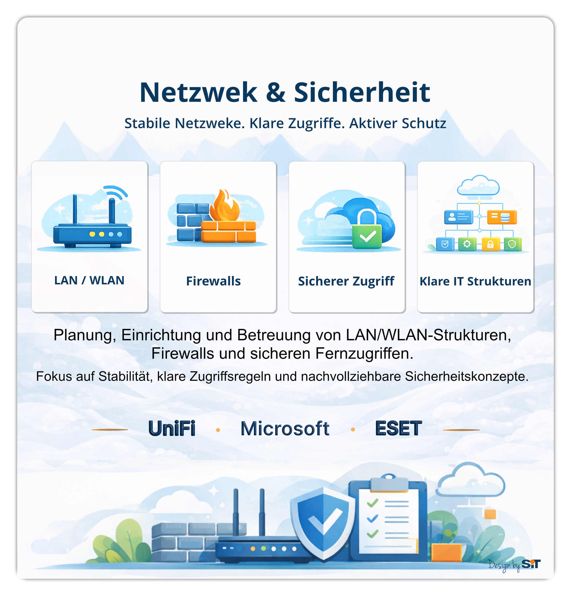 Planung und Betreuung von LAN/WLAN, Firewall-Systemen, sicheren Fernzugriffen sowie Benutzer- und Rechtekonzepten inklusive grundlegendem Monitoring.